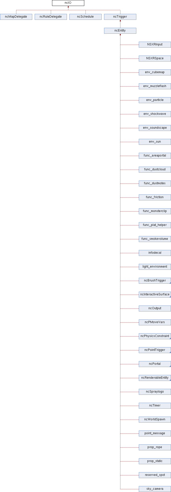 Reimplemented in env_particle, env_soundscape, light_environment, prop_static, button_target, cycler, env_beverage, env_explosion, env_message, env_model, env_shooter, env_spark, func_breakable, func_brush, func_button, func_door, func_door_rotating, func_guntarget, func_healthcharger, func_monsterclip, func_mortar_field, func_pendulum, func_physbox, func_plat, func_platrot, func_pushable, func_recharge, func_rot_button, func_rotating, func_tank, func_tracktrain, func_train, func_traincontrols, func_wall_toggle, game_counter, game_counter_set, game_zone_player, info_node, info_node_air, infodecal, item_ammo_crate, item_eyescanner, item_food, item_generic, item_healthcharger, item_item_crate, item_recharge, light, logic_auto, logic_case, logic_relay, logic_timer, momentary_door, momentary_rot_button, monster_furniture, monster_generic, monstermaker, multi_manager, multisource, path_corner, path_track, phys_ballsocket, phys_constraint, phys_constraintsystem, phys_convert, phys_hinge, phys_keepupright, phys_slideconstraint, point_camera, point_trigger, prop_door_rotating, prop_dynamic, prop_physics, prop_portal, prop_static, random_speaker, random_trigger, reserved_spot, script_model, scripted_sequence, targ_speaker, target_cdaudio, target_speaker, trigger_auto, trigger_autosave, trigger_capture_area, trigger_capture_point, trigger_cdaudio, trigger_changelevel, trigger_counter, trigger_endround, trigger_endsection, trigger_hurt, trigger_look, trigger_monsterjump, trigger_once, trigger_playerfreeze, trigger_relay, trigger_teleport, trigger_transition, ambient_generic, env_beam, env_bubbles, env_cascade_light, env_fire, env_fog, env_fog_controller, env_funnel, env_glow, env_instructor_hint, env_laser, env_projectedtexture, env_smoker, env_sprite, func_conveyor, func_friction, func_illusionary, func_ladder, func_lod, func_monitor, func_tankmortar, func_useableladder, func_vehicle, func_wall, info_particle_system, light_dynamic, logic_achievement, phys_rope, point_spotlight, prop_rope, prop_vehicle_driveable, speaker, trigger_camera, trigger_gravity, trigger_jump, trigger_push, ncCaptureItem, ncCapturePoint, ncOutput, ncMonster, ncTalkMonster, ncSound, ncBreakableBrush, ncSurfacePropEntity, ncActor, ncCharger, ncItem, ncPlayer, ncSpawnPoint, ncSpectator, ncPhysicsEntity, ncEntity, ncRenderableEntity, ncBrushTrigger, and ncPointTrigger.