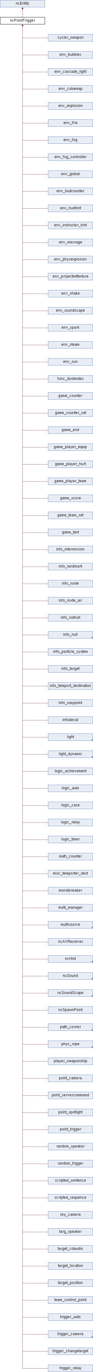 Reimplemented in env_soundscape, light_environment, env_explosion, env_message, env_spark, game_counter, game_counter_set, info_node, info_node_air, infodecal, light, logic_auto, logic_case, logic_relay, logic_timer, monstermaker, multi_manager, multisource, path_corner, path_track, point_camera, point_trigger, random_speaker, random_trigger, scripted_sequence, targ_speaker, target_cdaudio, target_speaker, trigger_auto, trigger_relay, env_bubbles, env_cascade_light, env_fire, env_fog, env_fog_controller, env_instructor_hint, env_projectedtexture, info_particle_system, light_dynamic, logic_achievement, phys_rope, point_spotlight, trigger_camera, ncSound, and ncSpawnPoint.