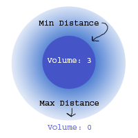 - dist_min / dist_max sets the radius where the sound fades out. The sound is at maximum volume inside 'dist_min' radius, and it completely silent after 'dist_max' radius.