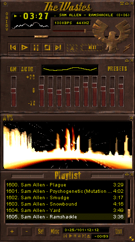 With this good news comes some sad news as well. Gaist, who's been the Number Two to my Dr. Evil since this whole mess started, who at times has stopped ME from quitting, has been hit hard by Real Life. I'm not going to recount the details, it's his own business - I'm taking a chance as it is writing this much. He's been a true friend through all this mess, and I think he'd feel a little better if you guys could just do the little you can for him. Stay with us, make sure that when Wasteland gets released all this work won't go unheard, unseen, and unsung.